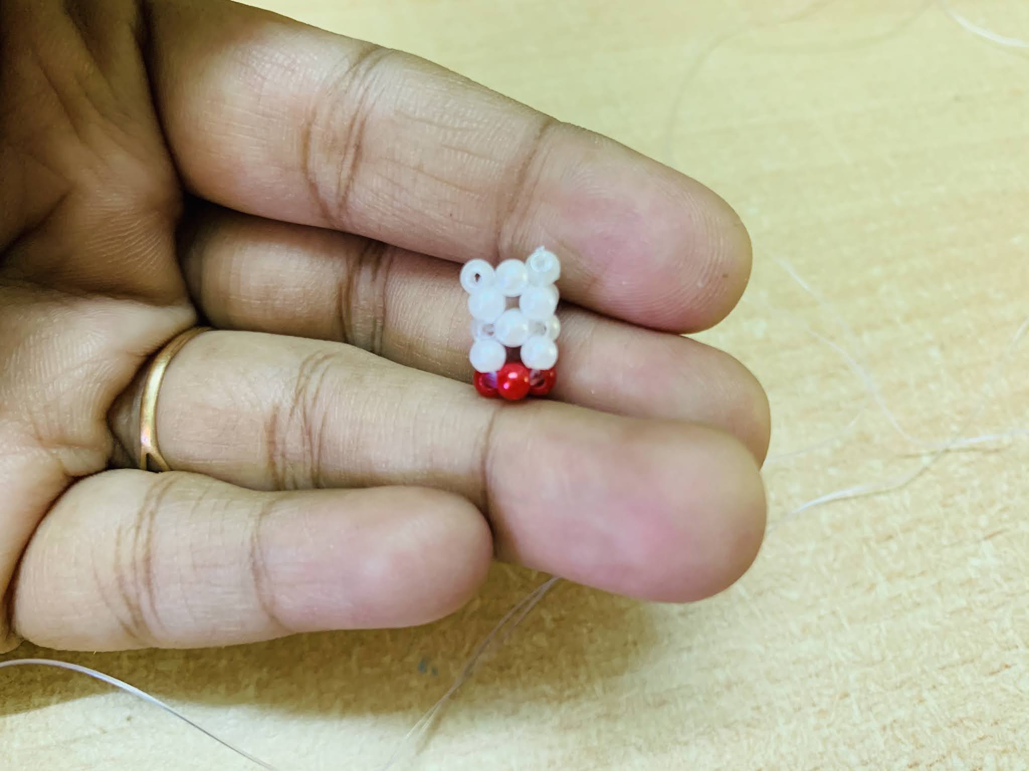 - First time you have to take 3 beads among which 2 red beads and 1 white bead in the middle to make the 4 beaded structure.